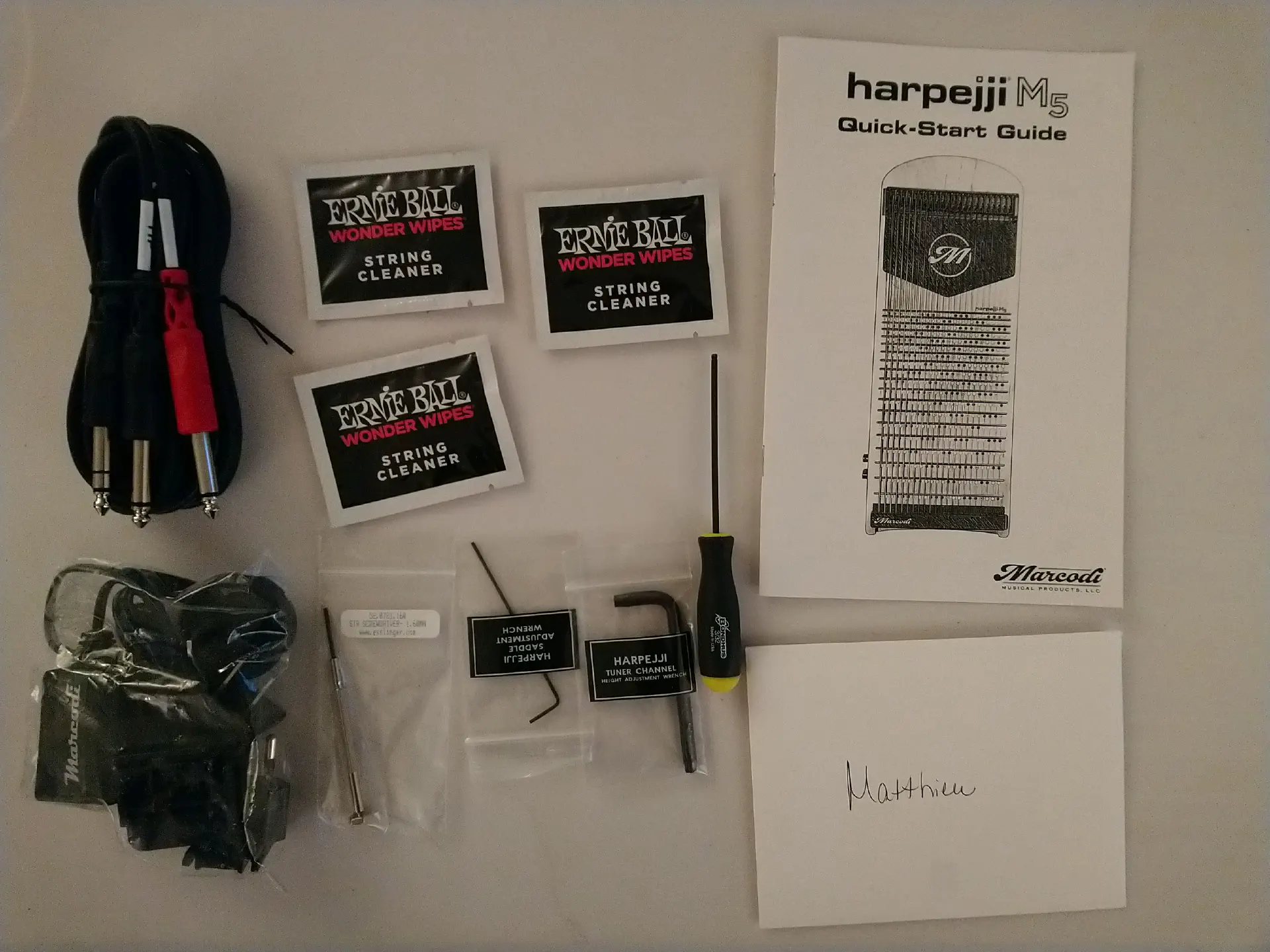 As far as I can remember, unpacking a harpejji in 2013 was just that: unpacking a harpejji (with cable and power supply). In 2025, I also got a “quick start guide”, a set of tools for tuning and tweaking the harpejji, a couple of string cleaning wipes and a nice, handwritten note from Joy Meeks.