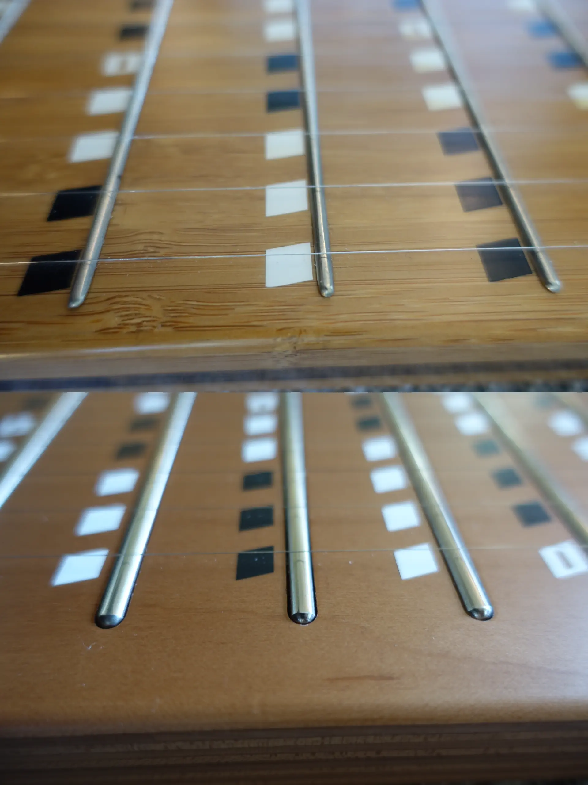 Maybe it’s out of habit, but I prefer the historic “rhombus” note markers rather than the newer “circle” ones (and I truly dislike “ABC” markers, so that was never an option). Hence rhombus is what I chose for my M5. Note that the markers on the new instrument are a few millimeters apart from the frets, unlike the older K24 where the markers were right behind the frets. I think the new design might lure beginners into hitting the strings a little bit too far from the frets, so I’m not sure this was a good design decision. But at least for an experimented player, the difference is very small and quickly gets forgotten.