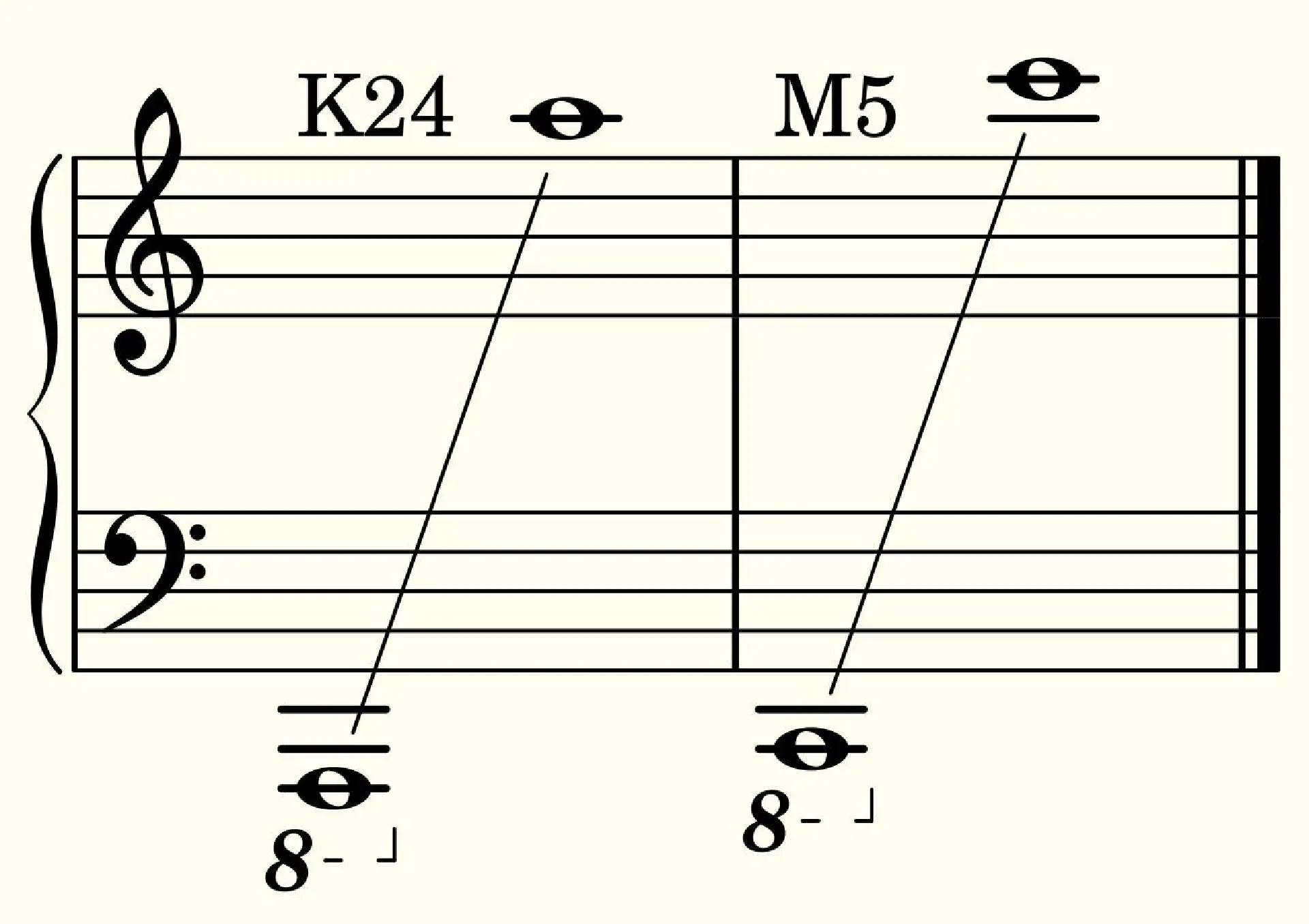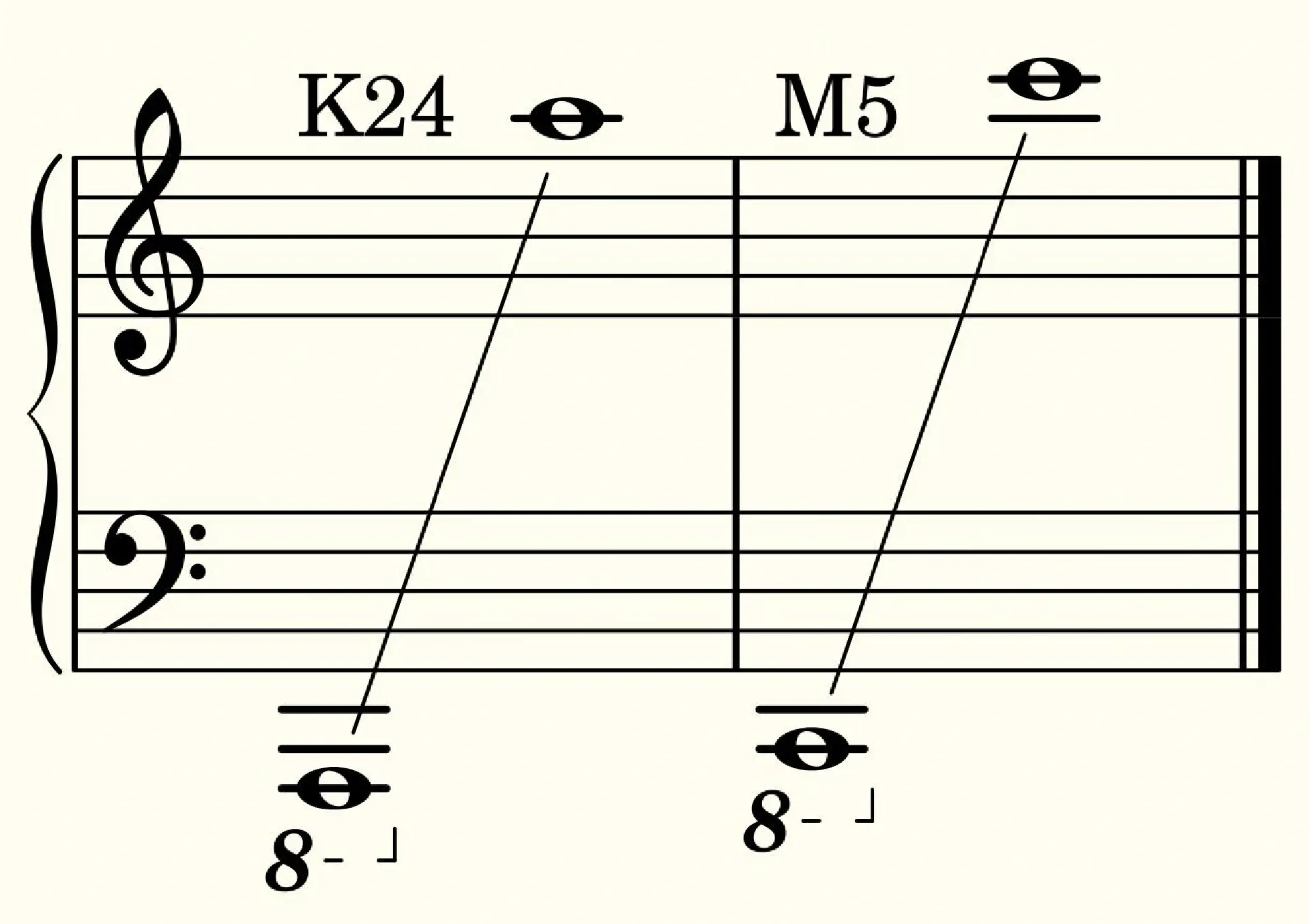 Marcodi has decided to change the string number, scale length and overall range of the instrument. The K24 has 24 strings and 15 frets, with exactly 5 octaves ranging from A0 to A5. The M5 has fewer strings (22), more frets (19) and also covers 5 octaves, but a minor third higher (C1 to C6).