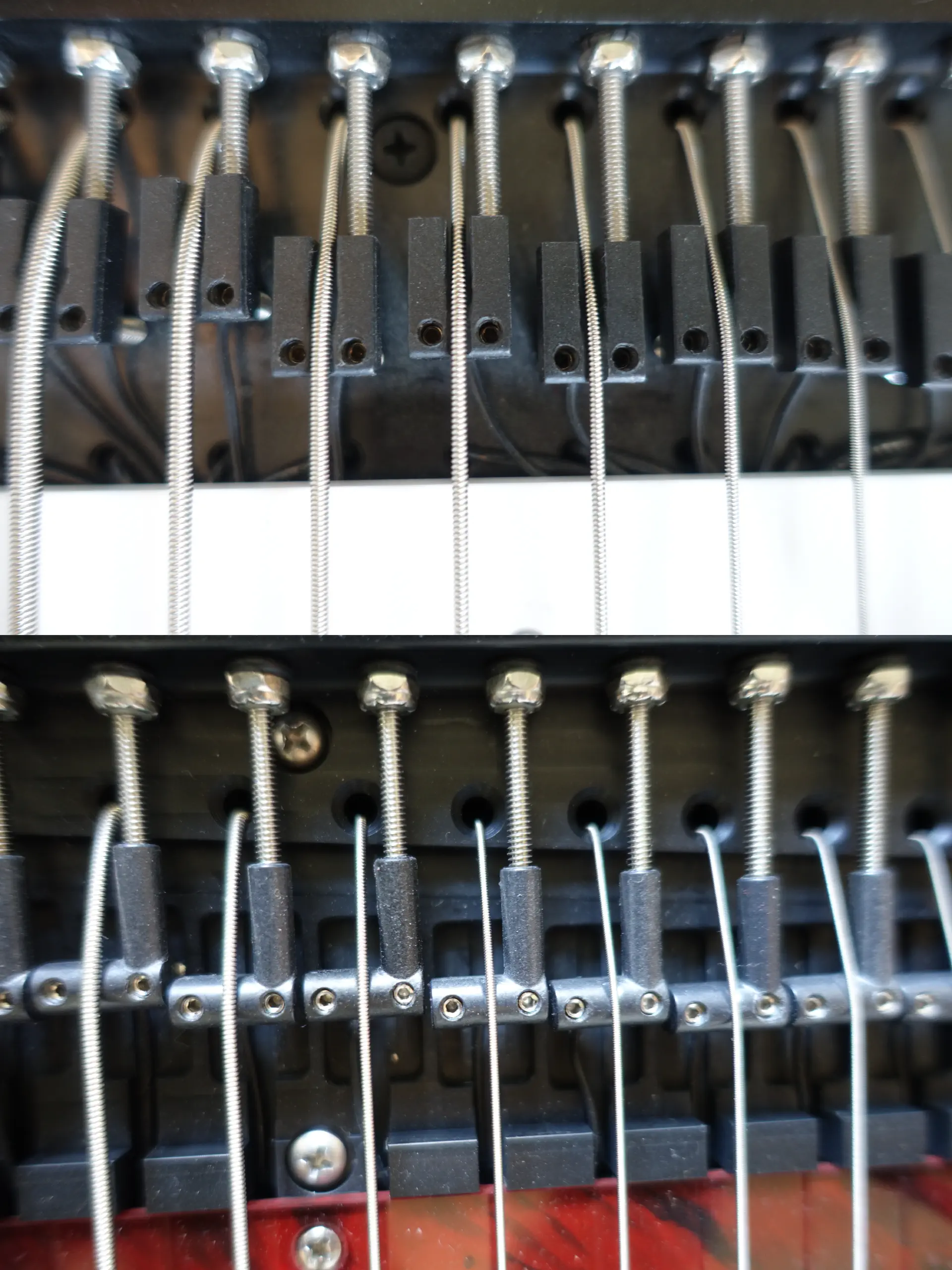 It might also be that the new saddles could simplify experimenting with different string gauges. I never felt the need, but I guess that someone wanting to put strings with other gauges on a K24 could have troubles with the specially filed saddles. If I understand well, all saddles on the M5 are identical, so experimenting with alternate gauges and/or tuning should be much easier. This is just a guess, though, that would have to be validated by Marcodi.