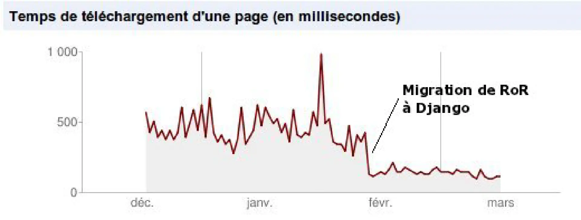Bien entendu, il ne s’agit ici même pas d’une comparaison malhonnête entre RoR et Django, c’est une non-comparaison. Entre “avant” et “après”, ont changé, en plus du langage et de framework:
